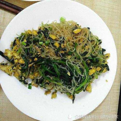 3.锅留底油,放入葱花爆香,放菠菜翻炒,看菠菜有些软了的时候,放粉丝翻炒,看菠菜基本软了,就放刚才摊好的鸡蛋,继续翻炒,出锅前放盐即可。
