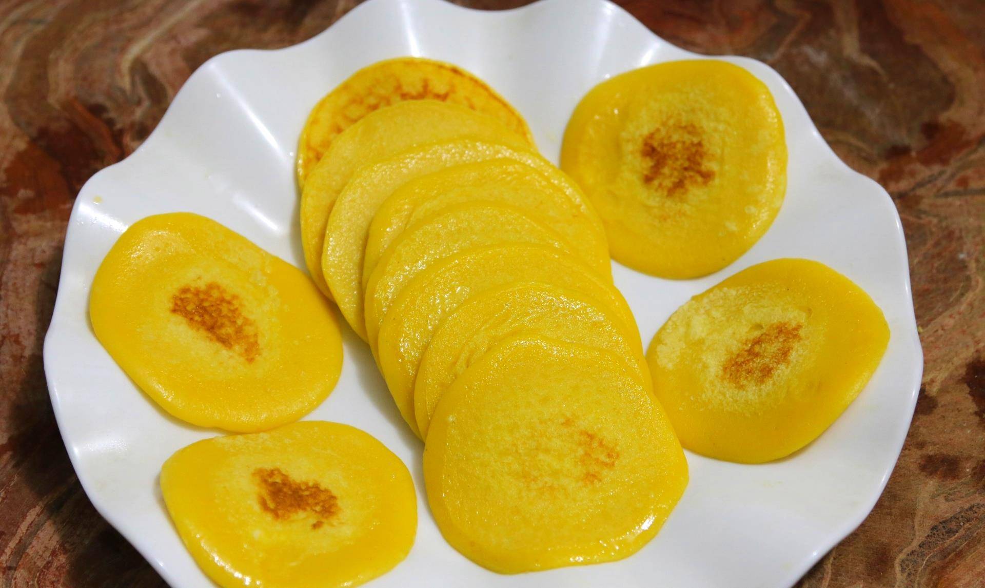 4、蛋卷表面凝固后,半分钟左右就可以用抹刀翻面了。两面微煎时,煎蛋差不多熟了,就可以装盘了。