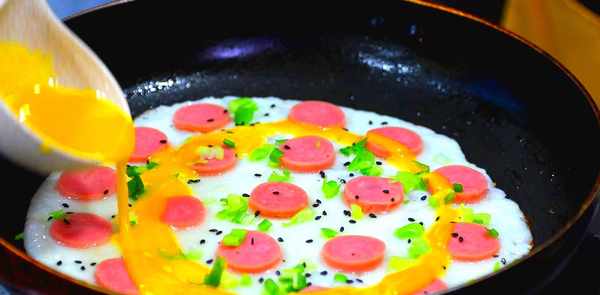 3.电煎锅烧热,刷一层食用油,倒入适量的面团,炸至油热,用刮刀刮平,放上切碎的火腿肠,撒少许葱花和黑芝麻,然后浇上。蛋黄少许,盖上锅盖。