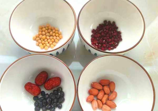 1、可根据家人口味定制。准备适量的黄豆、黑豆、红豆、花生和红枣,事先用清水浸泡。