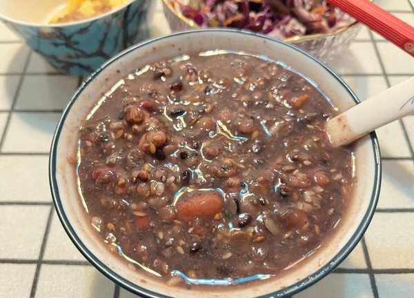 这一碗五谷杂粮粥,包含了十多种材料,包括几种米、豆、干果、果干、薯类,营养极为丰富。其中有美白消肿的慧米,抗衰老的荞麦米、燕麦,有补血乌发又富含膳食纤维的红豆、黑豆,有富含花青素的黑米、紫薯,有补肾养脾的山药,有养颜补血的红枣、葡萄干,有润肤的核桃仁、花生,如果想,还可以加更多的材料进去,营养、暖身、养颜、减肥,这一碗粥,都可以做到。
