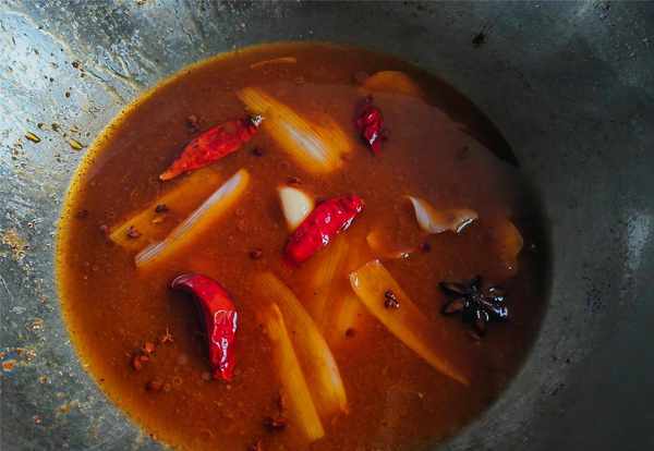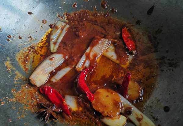 3.锅内加入油烧热,下入葱段,姜片,蒜粒,干辣椒,花椒,八角爆香。