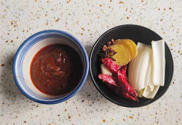 2.准备好调料,葱切段,姜切片,大蒜拍一下。酱用豆瓣酱、东北大酱,黄豆酱都可以。