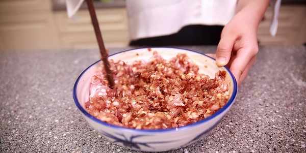 具体做法:首先将一块肥瘦相间的猪肉用刀炖成肉馅,肉馅剁好后倒入一个深点儿的瓷碗中,把葱花、姜末倒入肉馅中,撒少许胡椒粉、十三香,倒入适量生抽、蚝油,少来点儿食用盐、鸡精,用筷子充分搅拌均匀。把淀粉加水搅拌一下,然后一点一点倒入肉馅中,倒的时候要一边倒一边不停的用筷子顺时针搅拌,搅拌至肉馅润滑为止。