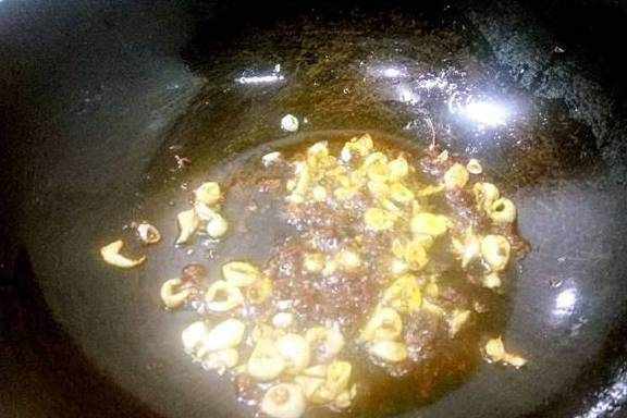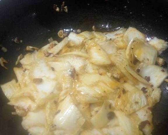 3锅内多放些底油,先放入花椒炸出香味,然后放入大蒜炒一下,加豆瓣酱生抽白菜开始煸炒!