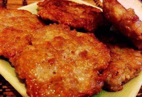 6,起锅倒油,油温升至6成热时,放入肉饼,保持中火,把肉饼的两面香煎成金黄色。把莲藕肉饼煎至蓬松鼓起来的状态,即代表肉饼煎熟了。