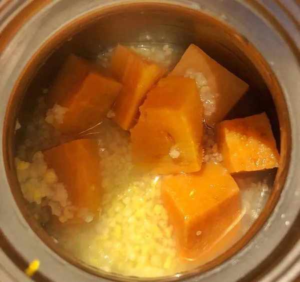 3,取一个干净的砂锅,把小米洗干净,放进砂锅中,把红薯也加进锅中。往砂锅中加入适量的清水,保持大火把粥煮开。