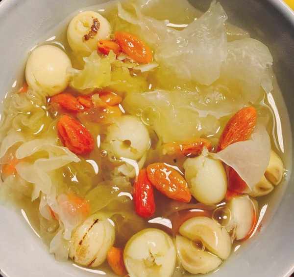 4,把莲子煲30分钟后,再放入银耳、冰糖和枸杞,继续煲10分钟,即可大功告成。