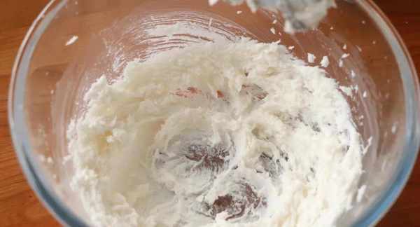 2、先搅拌搅拌均匀,再用电动打蛋器打匀。猪油会变得透气,颜色会变白;