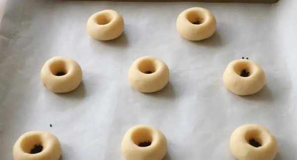 7、放在烤盘上,每个小剂子用手指戳洞,不要戳底,里面放入适量黑芝麻;