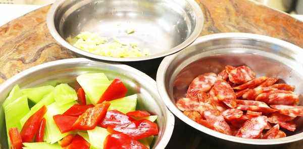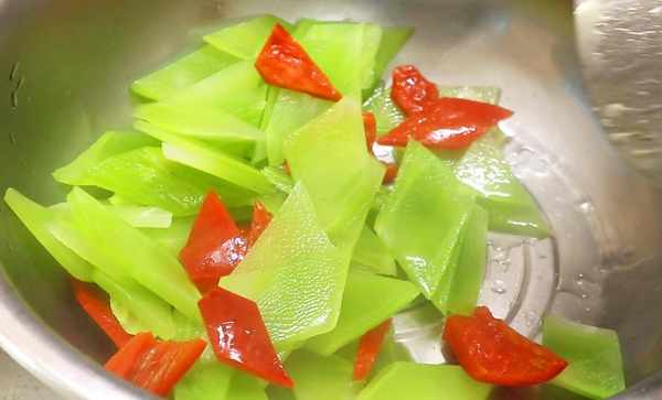 1、先将生菜去皮,切成菱形轮,盛入碗中待用。香肠三根,切成薄片,放入小平底锅中,准备红辣椒一半,切成菱形块,根据颜色使用。
