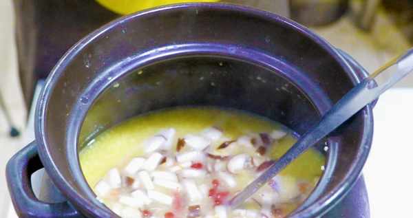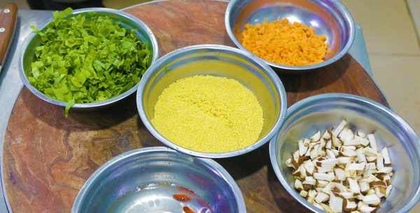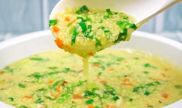2、锅内加入适量的水,倒入小米,加几滴香油,盖上锅盖,待水开后,小火煮20分钟。20分钟后,用勺子搅拌几下,让小米不粘锅。逐渐加入香菇和胡萝卜,加入羽扇豆,盖上锅盖继续煮5分钟。
