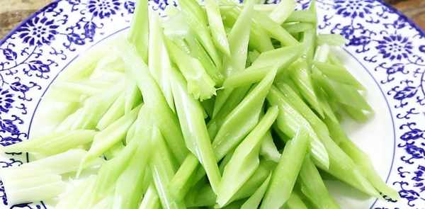 2、洗净的芹菜一小把,用斜刀切成菱形片,装盘待用。