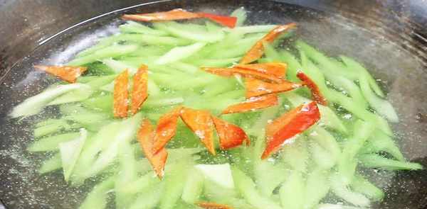 4.起锅加适量水,加几滴植物油,水开后,加入芹菜和红辣椒,焯水30秒左右,倒入泡好的百合,用勺子搅匀,继续漂烫30秒,取出控水倒入水槽。