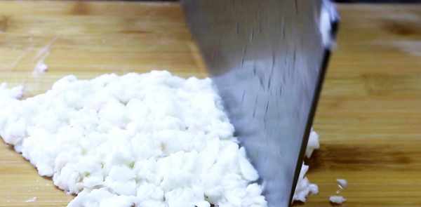 1、铁棒山药一根,洗净去皮,放在干净的砧板上,用刀做成山药糊,再用刀剁细,切好,放入碗中。