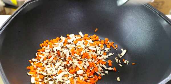 3、锅中加入少许食用油,油热后放入香菇和胡萝卜,用铲子翻炒几下,翻炒一分钟左右,将食材炒熟。