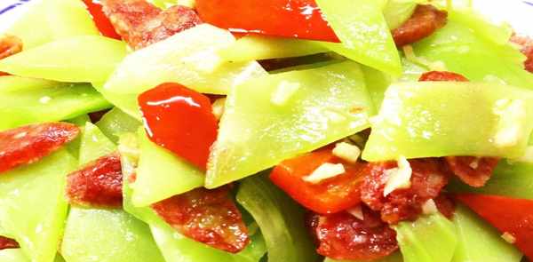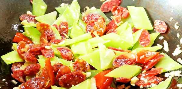 3、起锅烧热油,放入香肠翻炒,不断翻炒。香肠炒香后,加入姜末和蒜末爆香,然后加入生菜和红辣椒,略炒两下,开始调味。