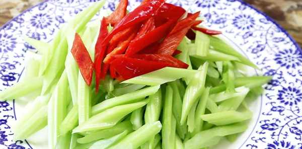3.半个红辣椒去籽,用刀切成菱形片,和芹菜拼色。