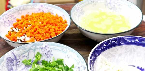 2.香菇几粒切丁,胡萝卜一半用刀切块,两片洗净的绿叶用刀剁碎待用,鸡蛋打入两个碗,加几滴白醋去腥味,用筷子拌匀。