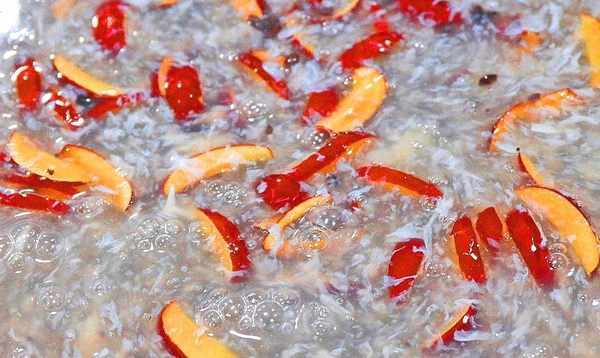 2、锅内加入适量的水,加入30克白糖,待水开后,倒入黑米和红枣,转动勺子几下,加入一勺水淀粉,煮至汤汁浓稠粘稠,起锅离火。