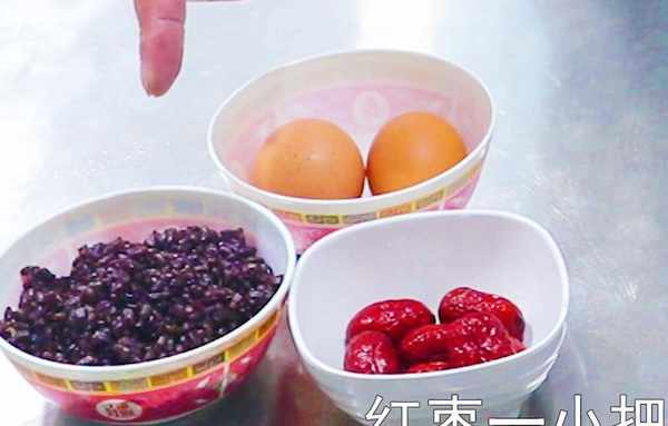 1.提前准备约两两熟黑米、一小把红枣和两个鸡蛋备用。红枣去核,切成薄片,放入碗中,鸡蛋打入碗中,蛋清蛋黄分离。将它们放在两个碗中,在装有蛋清的碗中加入少许水,然后用木勺搅拌均匀以分散它们。