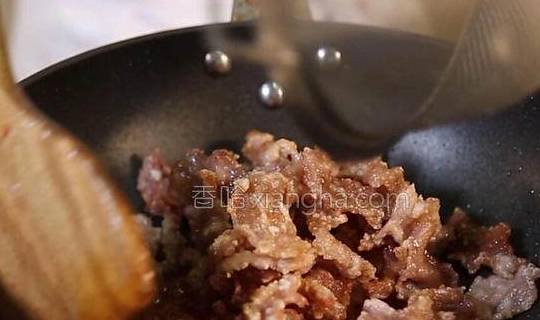 8.然后下入炸好的肉片,转大火进行翻炒。