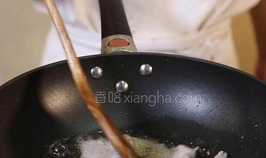 5.在锅中倒入色拉油500克,待油温烧到六成热时,将裹好糊的肉片下入油锅中炸脆,盛出备用。