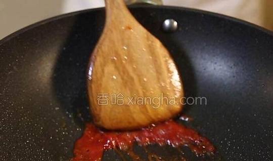 6.在锅中倒入番茄酱炒香,再加入白糖、白醋、盐、料酒转小火烧开。