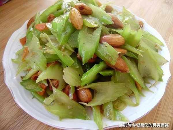 将切好的西芹焯水备用,这样口感更佳。热锅冷油放入杏仁,炸至浅金黄色,加入葱白、西芹翻炒均匀,加盐调味即可。