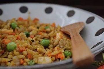 1.准备好做菜所需食材:鹅肝30g、三文鱼30g、米饭100g、豌豆30g、胡萝卜30g、鸡蛋120g