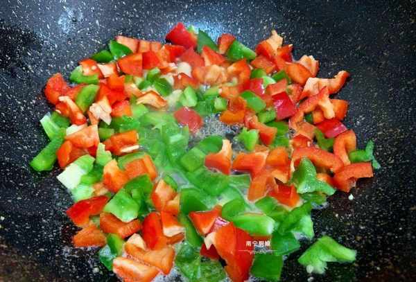 首先,我们把切碎的大蒜,然后是青红椒炒香;