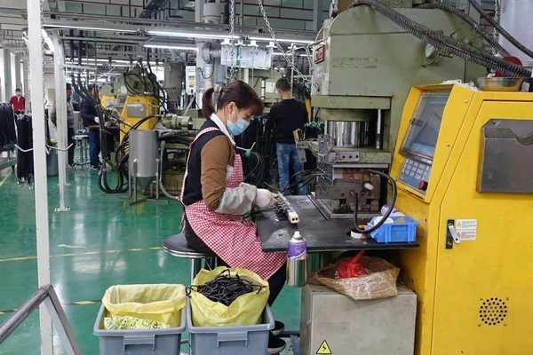 在崇左片区一电子企业精密电源线生产车间里,工人在成型注塑插头。