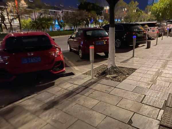 还有像这种路边停车桩,都是感应的,似乎是扫码停车,并且有车停在停车位的时候会变成红色,没车就是蓝色。