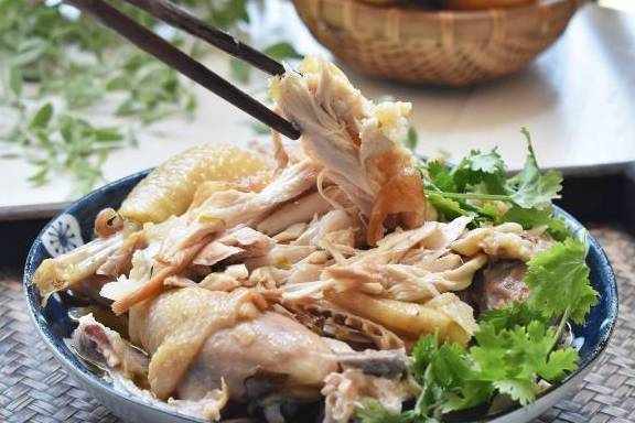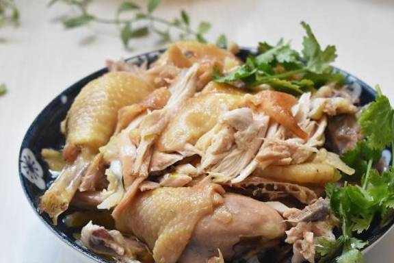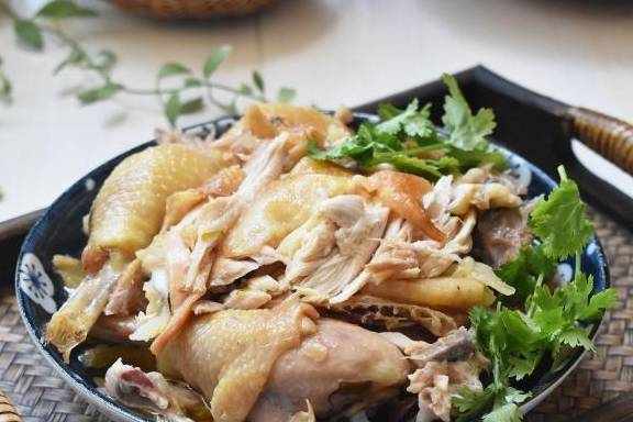 做好的盐焗鸡可以放凉切块,我家人比较喜欢吃手撕鸡,我一般都会把鸡块撕成鸡丝,把电饭煲里的汁料淋在鸡块上面。