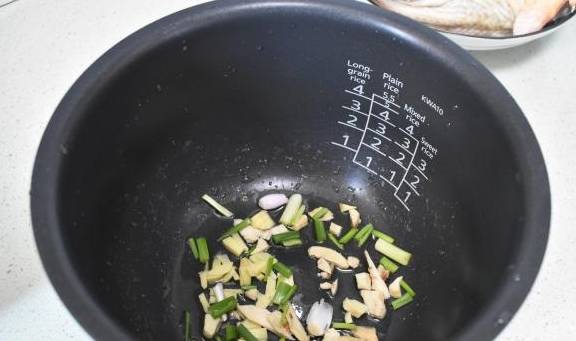 3把少许油放在电饭煲里,葱切细粒,沙姜和姜切成丝,放在电饭煲里。