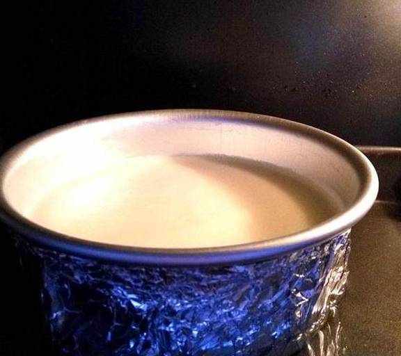5.将芝士糊倒入处理好的模具中,用水浴法,将模具坐在盛了冷水的烤盘里,放在烤箱中层,上下火150度烤60分钟左右。