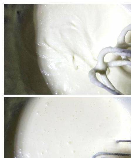 4.把装奶油芝士的打蛋盆坐在热水中,加入细砂糖,用打蛋器搅打至顺滑。将鸡蛋打散后,分次加入奶酪中,不断以打蛋器打到完全融合,再加入淡奶油柠檬汁和香草精拌匀。