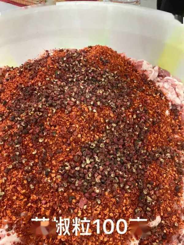 第2,花椒粒比花椒粉颜色更鲜。不知道大家发现没有,为什么有些人做出来的腊肠发黑,切成片摆在盘子里颜色也不好看,乌漆嘛黑的,就是这个原因。