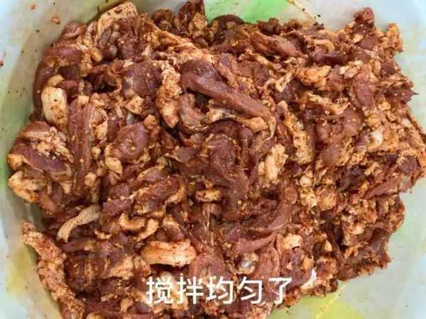 肉沥干后开始切,先切片再切条,切好后就可以放调料了。