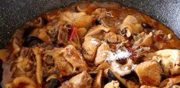 煮至汤汁不多的时候,揭开盖加盐,少量的来一点的糖,炒匀,继续炖。