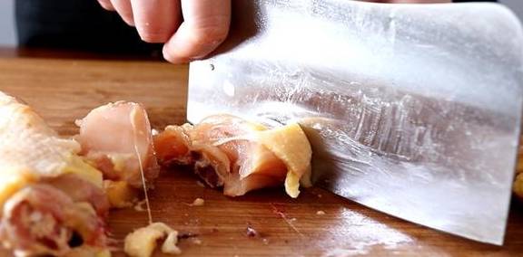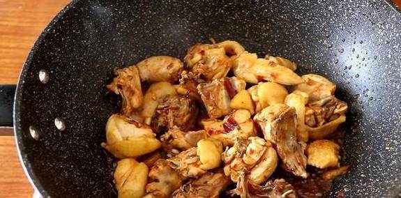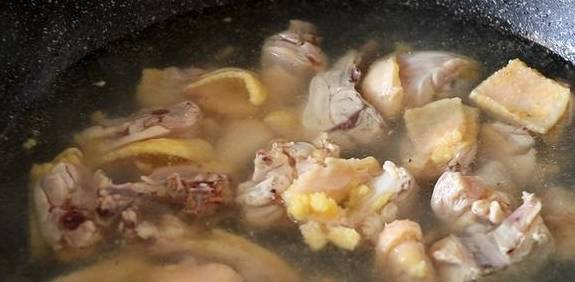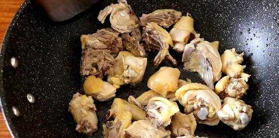 锅内倒油,下鸡肉翻炒。加姜片和料酒去腥。