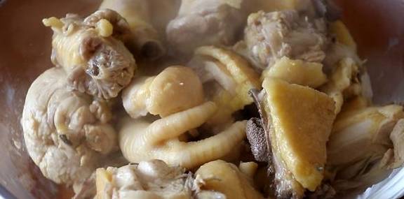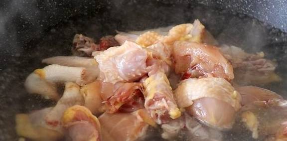 锅内倒水,将水烧开后,倒入鸡肉焯水。焯好后捞出沥水。