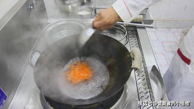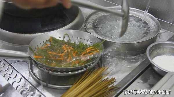 现在把胡萝卜丝和海带丝焯一下水,锅里烧水,水开后先把胡萝卜丝倒入锅内,焯水30秒后。