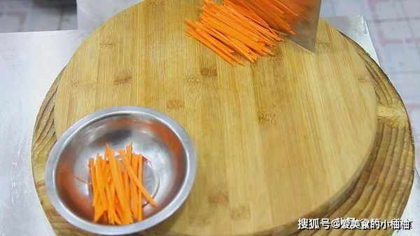 接下来我们再取出半个胡萝卜,和海带丝拌在一起用来配色,把胡萝卜先切成薄片,再改刀切成细丝,丝尽量切细点,切的越细越好入味。