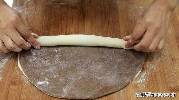 取出白色面团放在案板上,擀成和红面团一样大小的面皮。然后把红色面皮和白色面皮叠在一起,有不一致的地方可以再修整一下,随后,从一边开始往里卷,一定要卷实一点,收口处朝下。