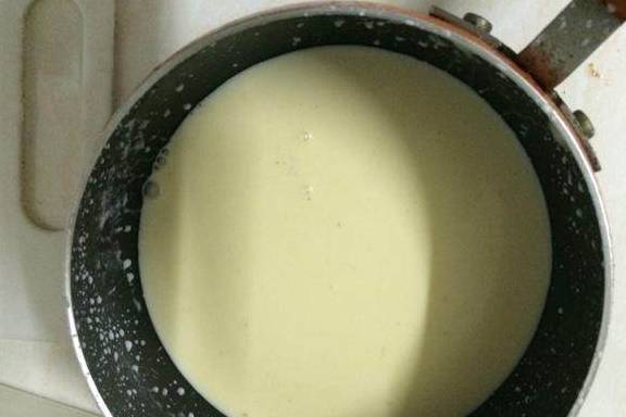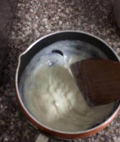 4.将奶锅端到火上,小火加热,用一个大勺子缓缓搅动。小心,小心!当勺子在搅动中,感到底部微有阻碍感,就说明快熬好了。这时候转中火,飞快地搅动叉子,十来秒左右液体会变得粘稠,呈凝固成胶水状,立刻离火,不要停止搅动,一边搅一边倒入铺好了保鲜膜的饭盒里。(我熬的这个状态略有一点过。因为拍照去了,没有来得及离火。其实可以熬嫩一些。)饭盒里铺保鲜膜,是为了取的时候容易,同理我们在饭盒里刷油也行的。
