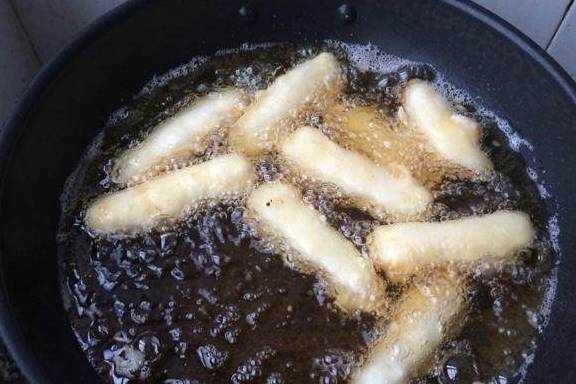 10.奶馅挂完糊之后,我们在5层的油温中,中火炸制。我把奶馅放入锅中的手法是这样的,两手各提着奶馅的一头,中间下垂浸入油面,然后轻轻放下两头。为什么要拎着两头呢?如果只拎一头,挂的糊会流向下另一头,导致炸出来的成品,一头大一头小。如果不拎,直接扔进去,油会荡出锅外,糊也容易散。注意,挂好糊的奶馅下锅后,5秒钟之内一定变白,并且会浮起来。如果5秒钟之内没浮起来,说明油温低了,要增大火力。如果浮起来就变黄了,说明油温高了,请关火稍微冷一下再继续炸。