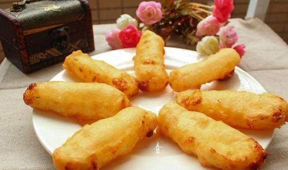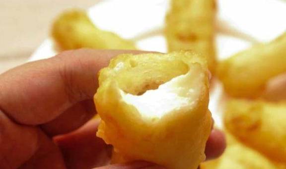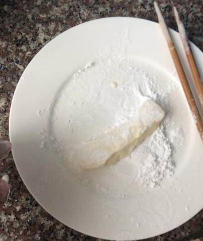 8.终于,要炸了。我们先在奶馅条上拍上一层干粉。通常,比较湿的原料挂糊前,会先拍一层生粉,糊会挂得更稳。这个方法叫拍粉拖蛋。比如,炸鱼片,炸豆腐,都是这样。