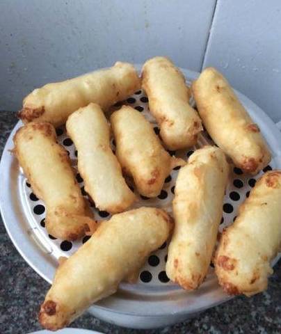 11.挂糊的奶馅变白浮起来后,迅速捞出,放在网上滤油。同时,开大火加热锅中的油,加热到8成油温。判断方法是,筷子插入油锅后,油会在筷子周围翻腾,伴随有爆炸声。这时候将炸好的奶馅重新倒入油锅,用漏勺翻动炸制,3秒左右会全部变成金黄。这时,全部捞到滤网上稍微冷却,温热时再装盘。千万注意,如果不在滤网上稍微冷却一下,让多余水分散发掉,直接装盘会导致表皮受潮变绵。OK,整个过程说完了。我已经说得尽量详细。奶馅中我添增加了黄油和炼奶来增加奶香,表皮换成了发粉脆糊。让我想一想,还有没说到的吗?