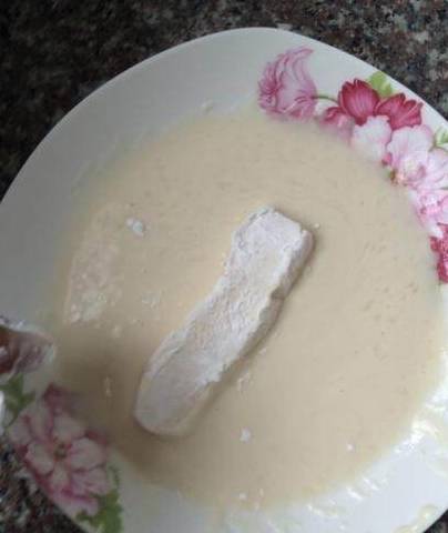 9.然后,我们开始挂糊。由于我们切的是很薄的长条,我建议不要用筷子,直接用手挂上,不然很容易断。我是一个连豆腐脑都能用筷子夹起来吃的吃货,用筷子的技术已经炉火纯青,但是这个也没有办法用筷子夹着挂糊,所以我相信多数人都很难办到。因为奶馅太滑太嫩了,真的不好易翻面。用手,用手!